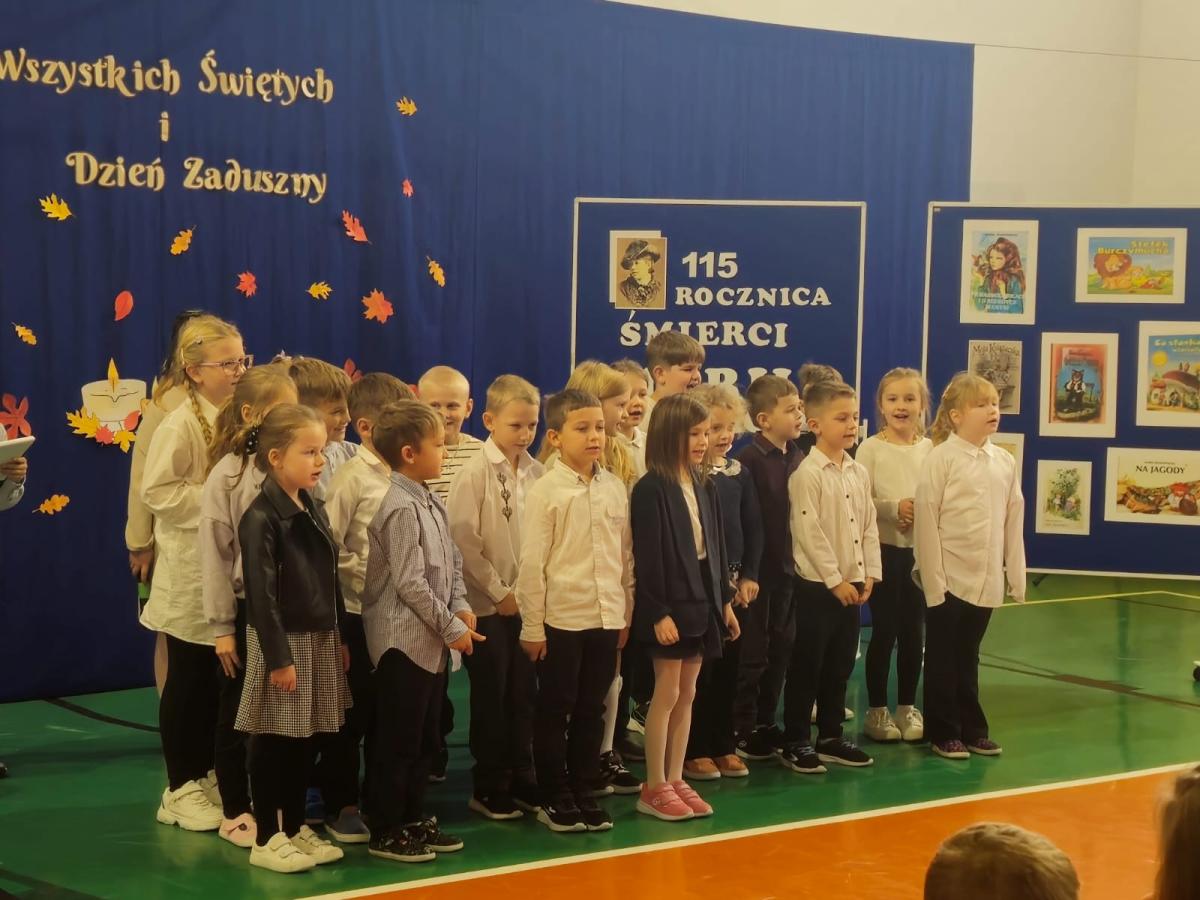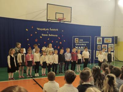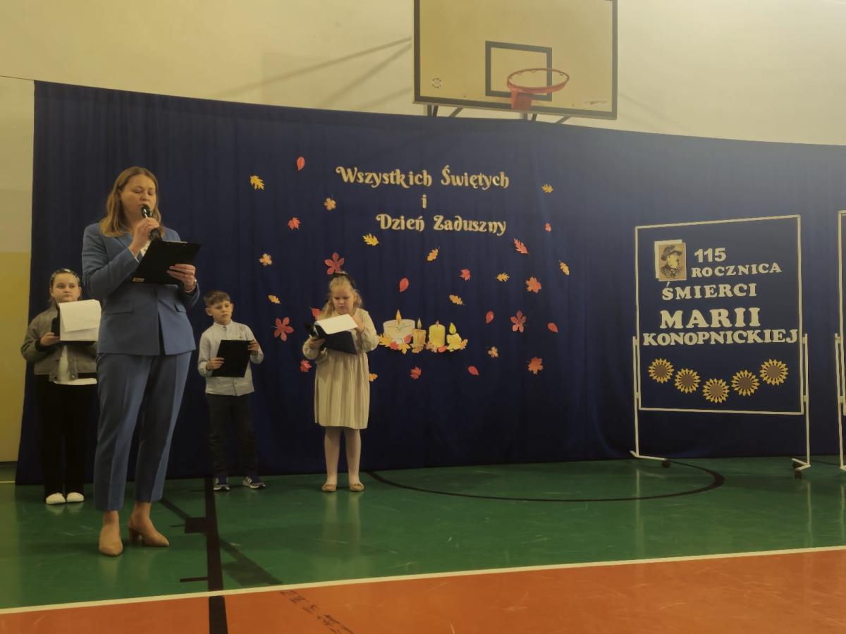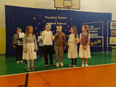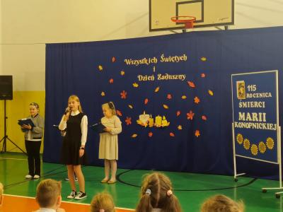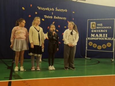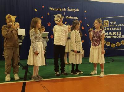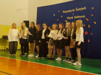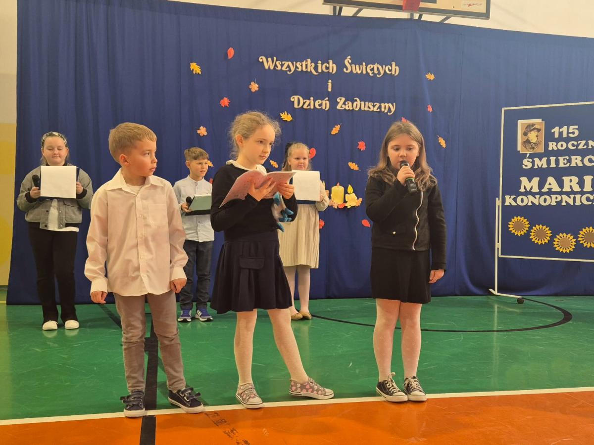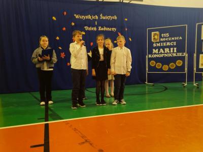 Uczniowie zaprezentowali program artystyczny przygotowany pod kierunkiem nauczycieli. Występ obejmował recytacje wierszy Marii Konopnickiej, krótkie inscenizacje oraz wykonanie pieśni „Rota”. Nie zabrakło również recytacji wierszy zwiaząnych ze Świętem Zmarłych. Uczestnicy uczcili minutą ciszy pamięć wszystkich, którzy odeszli.