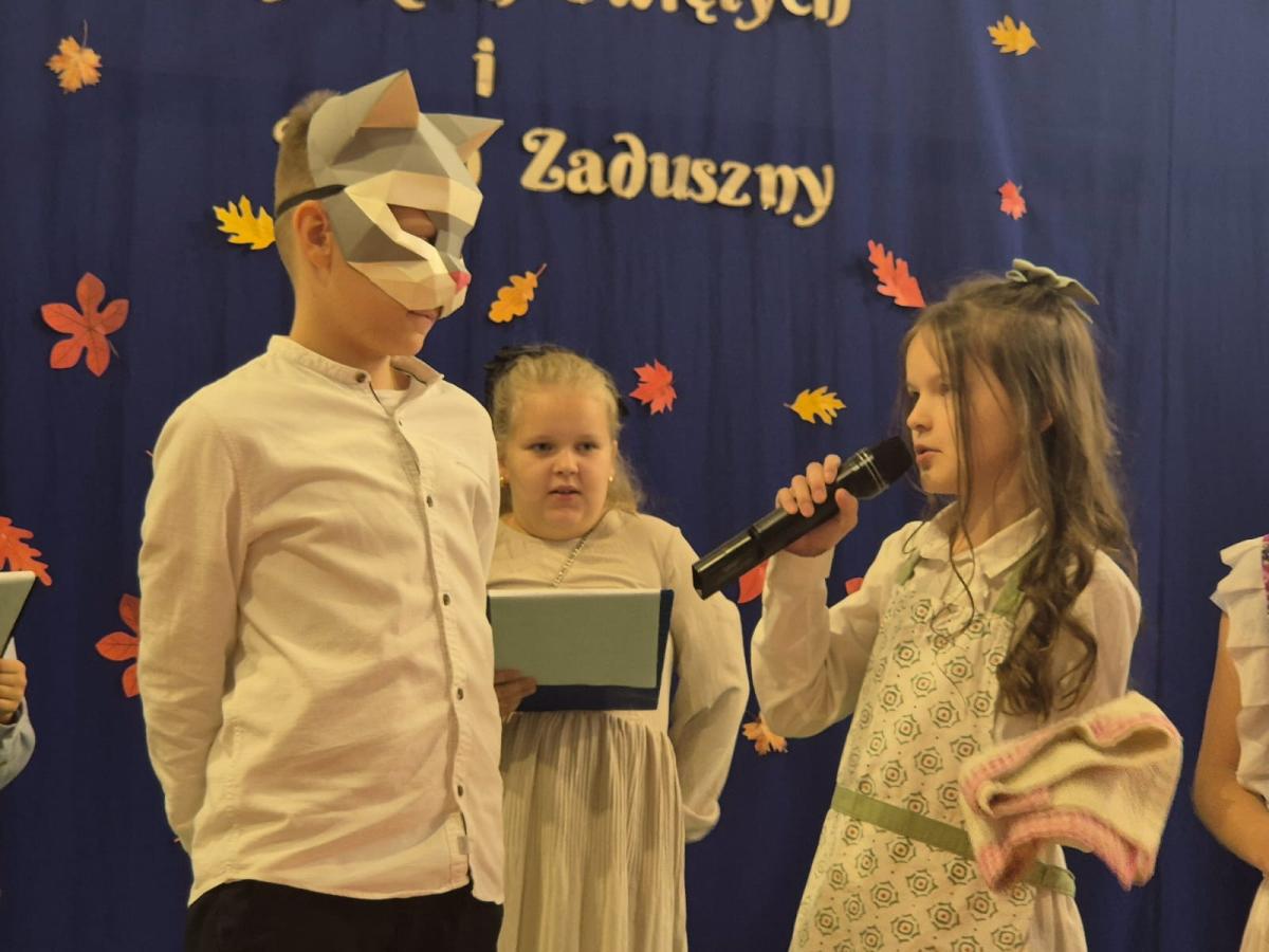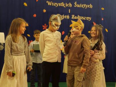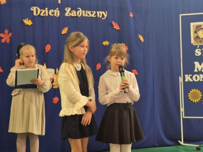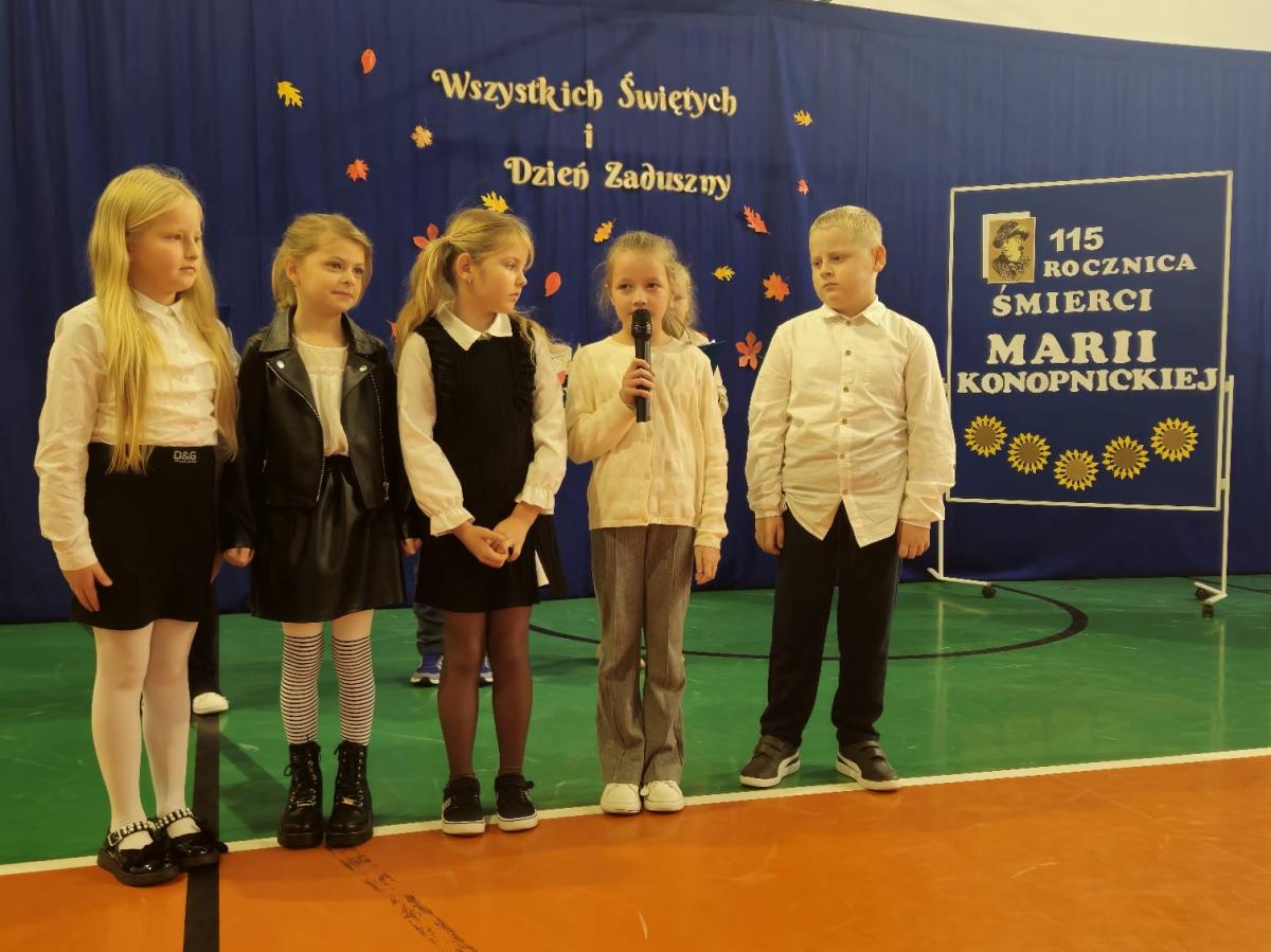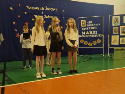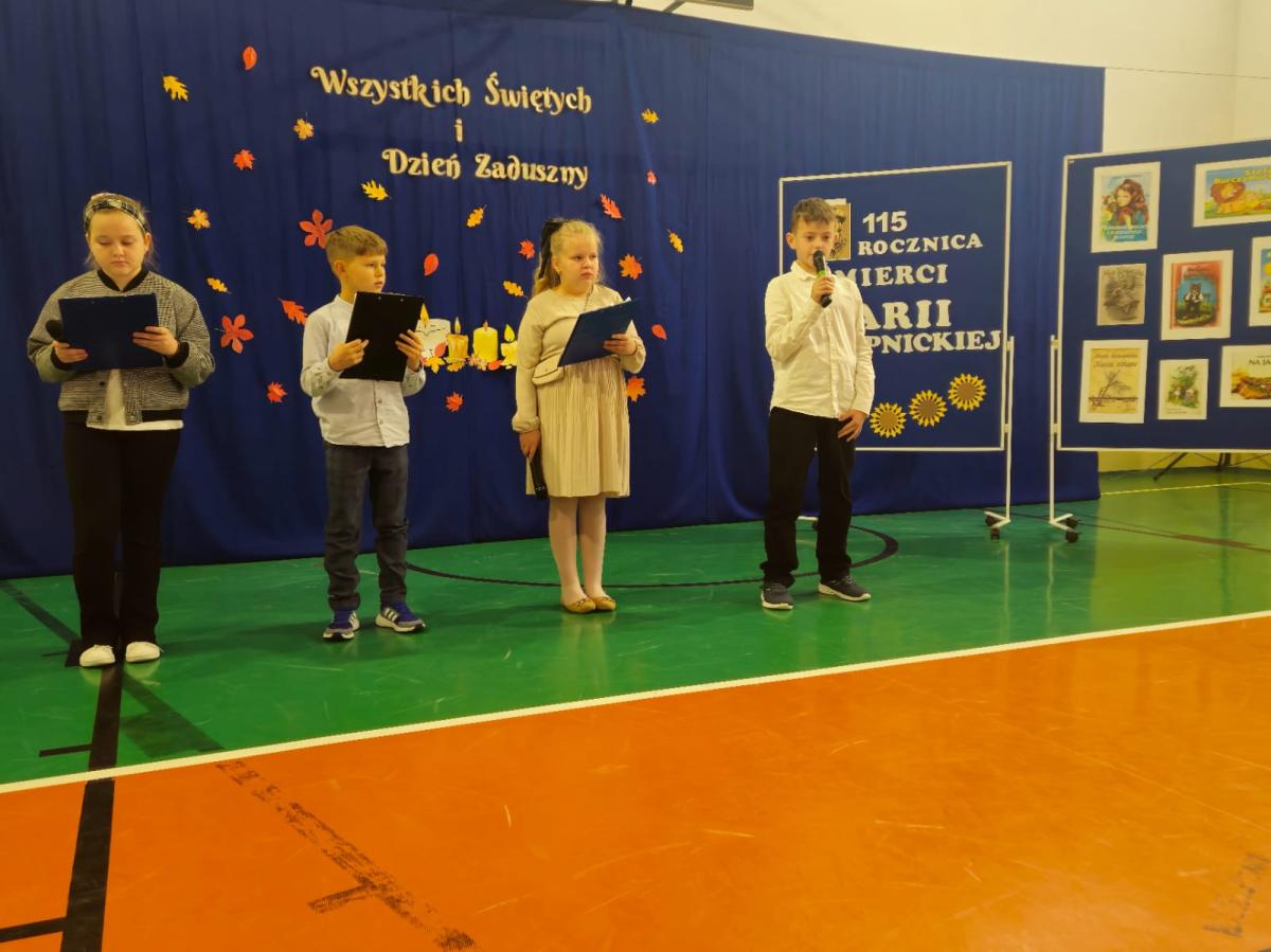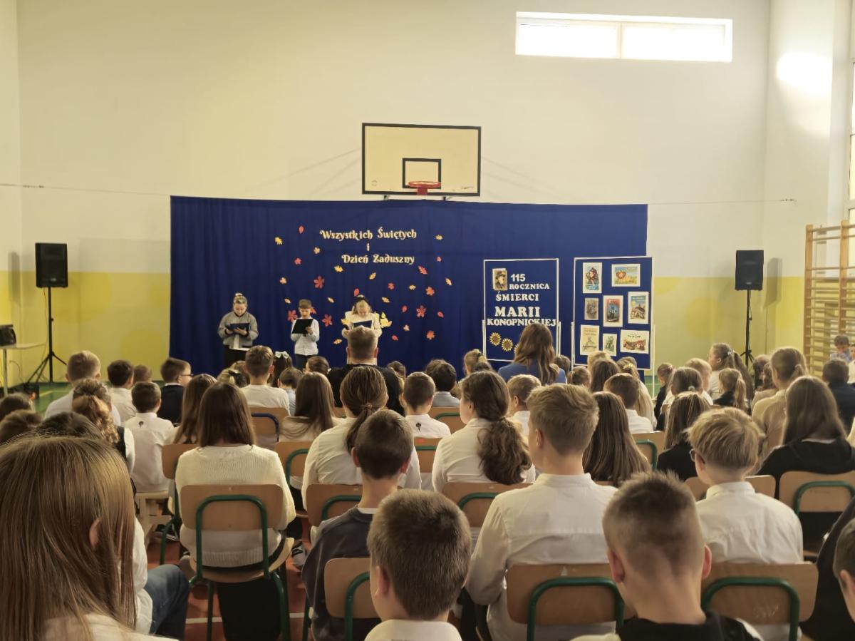 Uczniowie zaprezentowali program artystyczny przygotowany pod kierunkiem nauczycieli. Występ obejmował recytacje wierszy Marii Konopnickiej, krótkie inscenizacje oraz wykonanie pieśni „Rota”. Nie zabrakło również recytacji wierszy zwiaząnych ze Świętem Zmarłych. Uczestnicy uczcili minutą ciszy pamięć wszystkich, którzy odeszli.