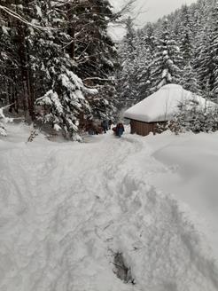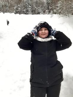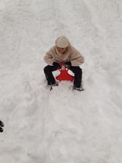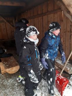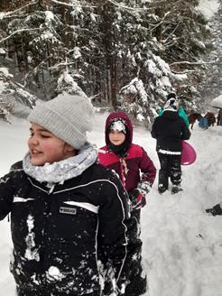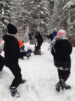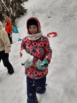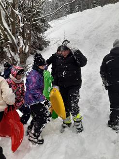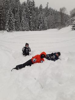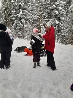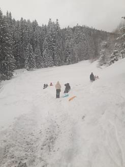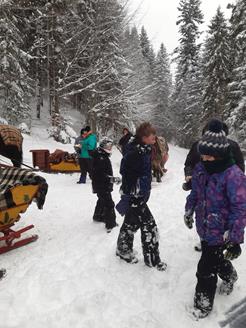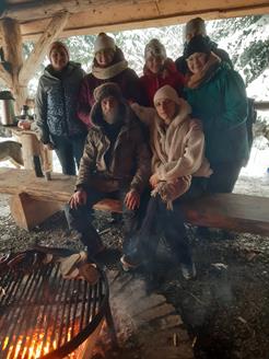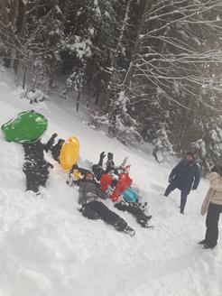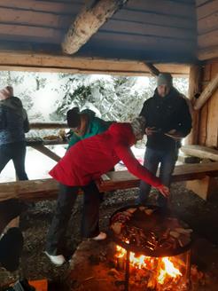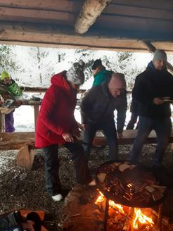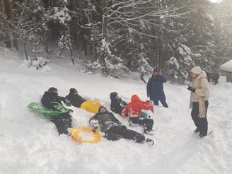Dziewczyny i chłopcy spędzili dużo czasu na świeżym powietrzu, na zaśnieżonej polanie, bawili się na śniegu, rozmawiali, biegali i zjeżdżali po stromym stoku. Rodzice w szałasie rozpalili ognisko, piekli kiełbasę, a następnie zaprosili wszystkich na smakowity posiłek z gorącą herbatą i pysznym ciastem na deser.
