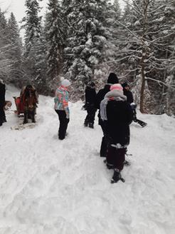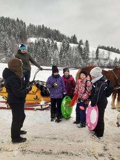 Kulig dla uczniów klasy 5 zorganizowali rodzice – zaprzęgi konne, ognisko, kiełbasa, poczęstunek, herbata. Była to dla wszystkich lekcja edukacji, integracji, współpracy, odpowiedzialności i aktywnego wypoczynku. Wycieczka - kulig dostarczyła dużo radości, integracji z rówieśnikami, opiekunami i rodzicami oraz wzmocniła więzi i zregenerowała siły do nauki.