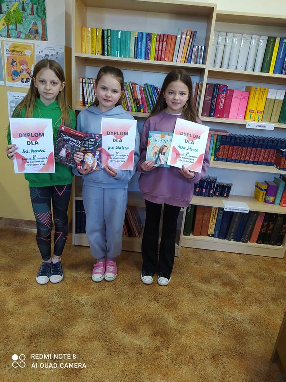 W listopadzie w bibliotece został przeprowadzony konkurs czytelniczy dla kl.3. Uczniowie mieli do przeczytania lekturę pt.: "Asiunia". Najlepszą znajomością treści wykazała się Alicja Bielska, drugie miejsce zdobyła Oliwia Dawiec, a trzecie Antoni Noworolnik. Gratulujemy i zachęcamy do dalszego czytania książek.